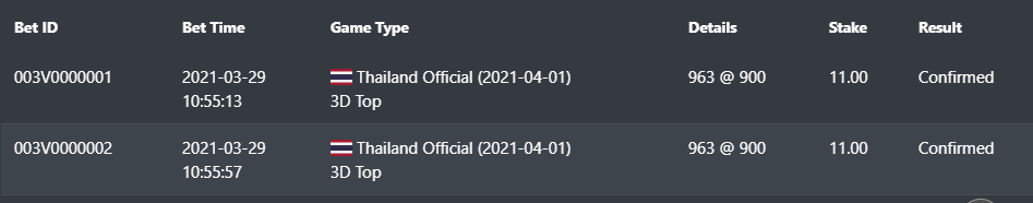 • รายการเดิมพันลอตเตอรี่จะถูกบันทึกไว้ทุกวัน โดยสมาชิกสามารถเข้าไปตรวจสอบประวัติเดิมพันได้จากหน้าเกมส์นั้นๆ